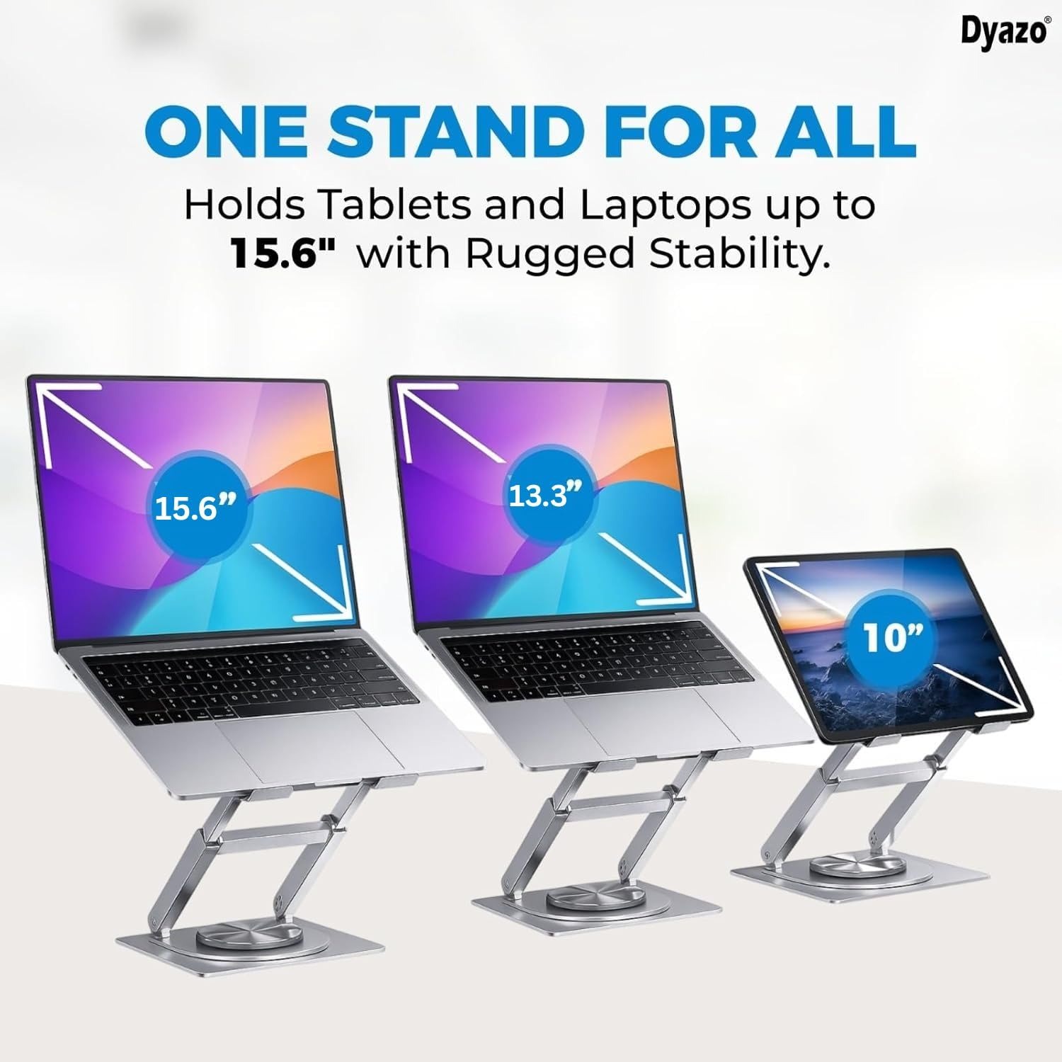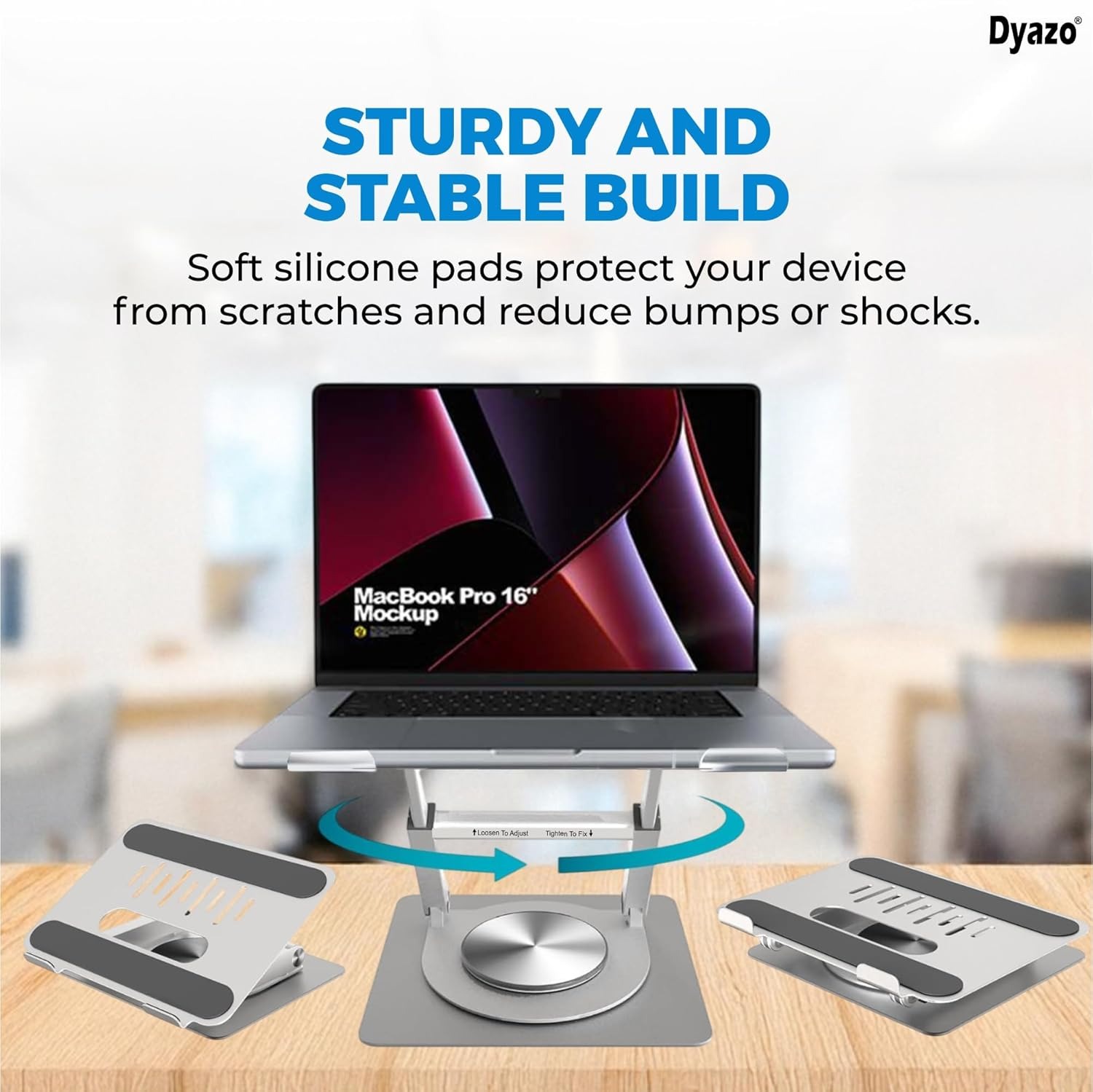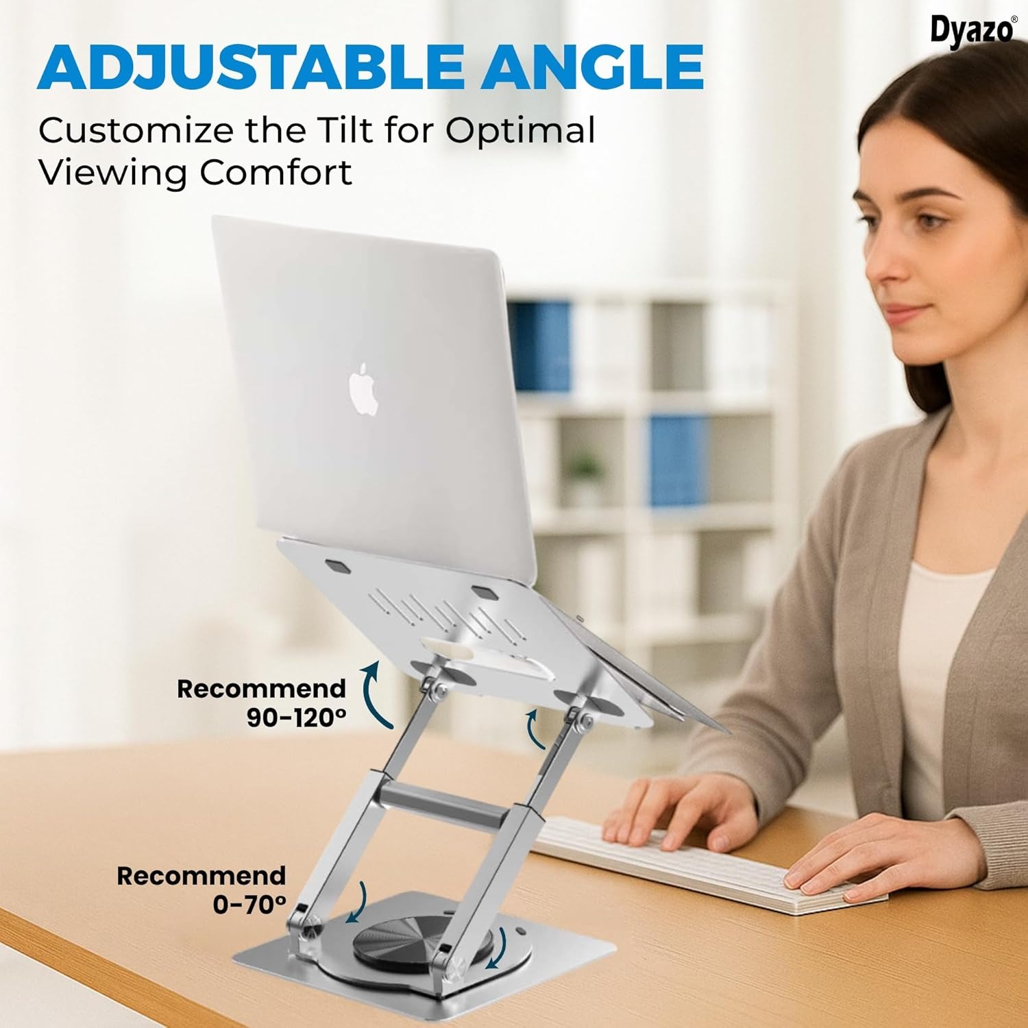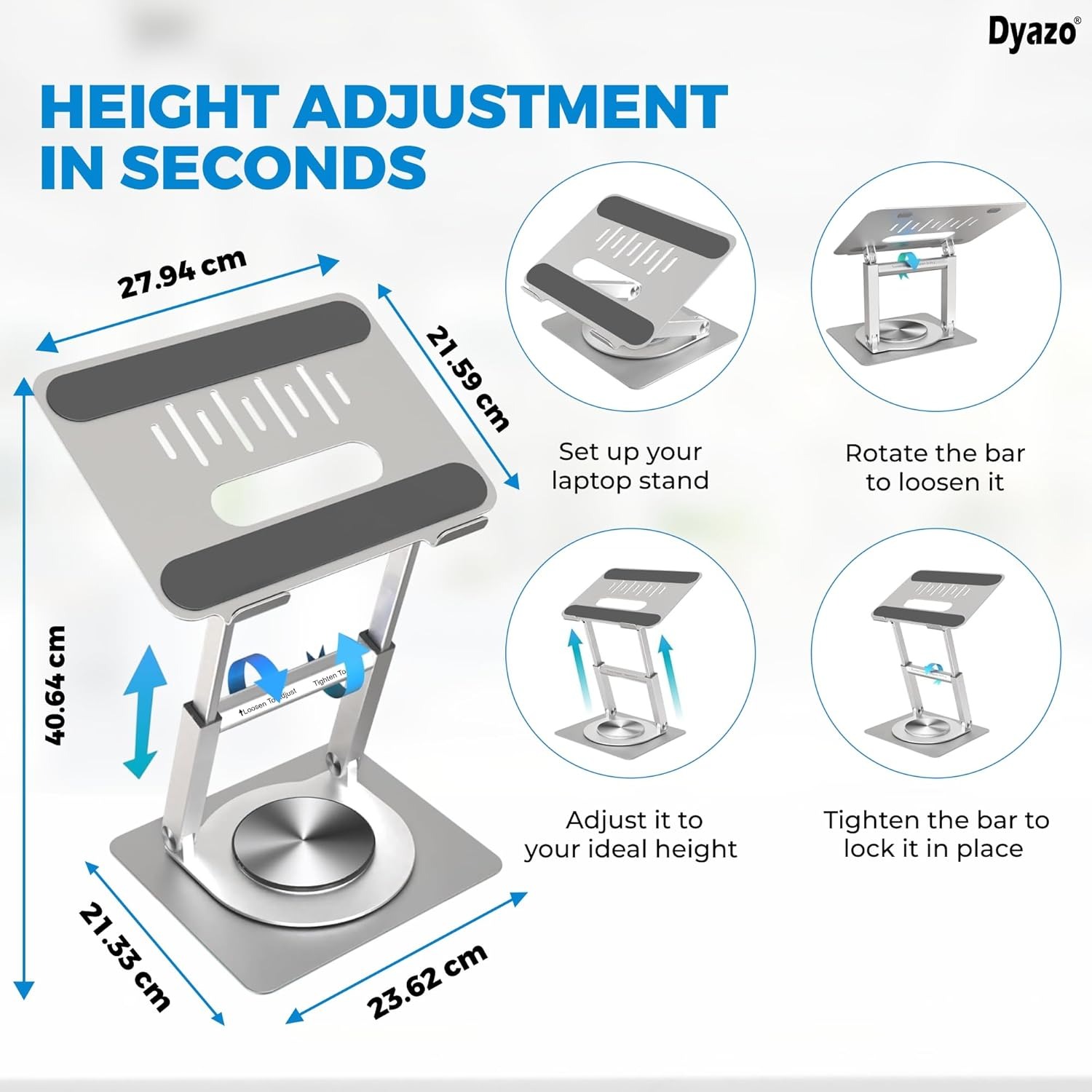 360° Rotating Base for Versatile Viewing – The Dyazo laptop stand features a smooth 360 degree swivel base, allowing effortless rotation for seamless multitasking, collaboration or adjusting screen angles for optimal ergonomics.